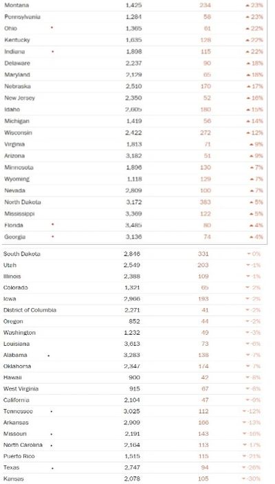 Washington Post sampling of states with overall Covid cases per 100K, new this week, % up/down.